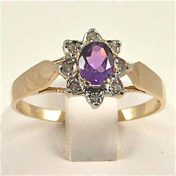 Suomalainen diana-sormus ametistilla ja timanteilla