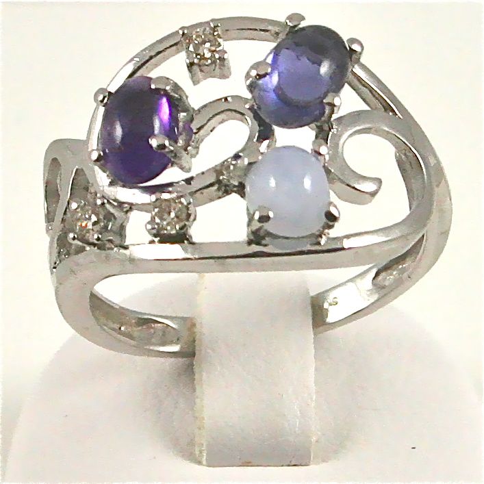 Kalsedoni-ioliitti-ametisti-timantti -sormus